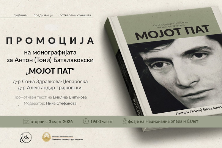 На 3 март 2026 година (вторник), со почеток во 19:00 часот, во фоајето на Националната опера и балет ќе се одржи промоцијата на монографијата „Мојот пат“, посветена на животот и професионалниот опус на Антон (Тони) Баталаковски – една од најзначајните личности во историјата на македонскиот балет.