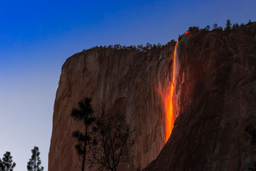 Спектакуларниот природен феномен се подготвува да го осветли вечерното небо во националниот парк во американската сојузна држава Калифорнија. Познат како „огнен водопад“ Јосемити (Yosemite Firefall), оваа глетка прави еден од водопадите во националниот парк, наречен Хорстејл, да засвети во силна портокалова боја – наликувајќи на лава што се слева низ вулкан.
