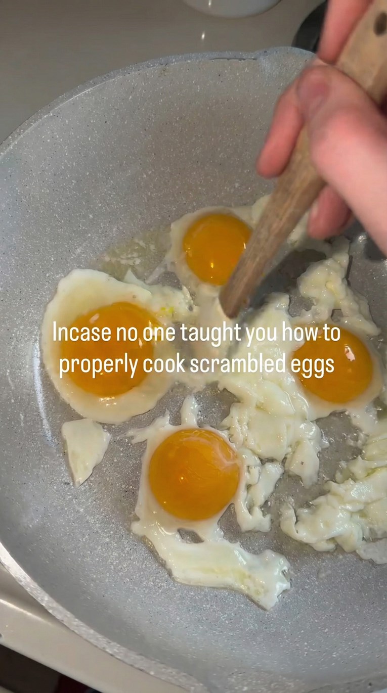 Во снимката на Инстаграм, која стана вирална, жената крши четири јајца директно во тавата, наместо прво да ги измати во сад, па најнапред ги запржува белките, а дури потоа во нив ги вмешува жолчките.