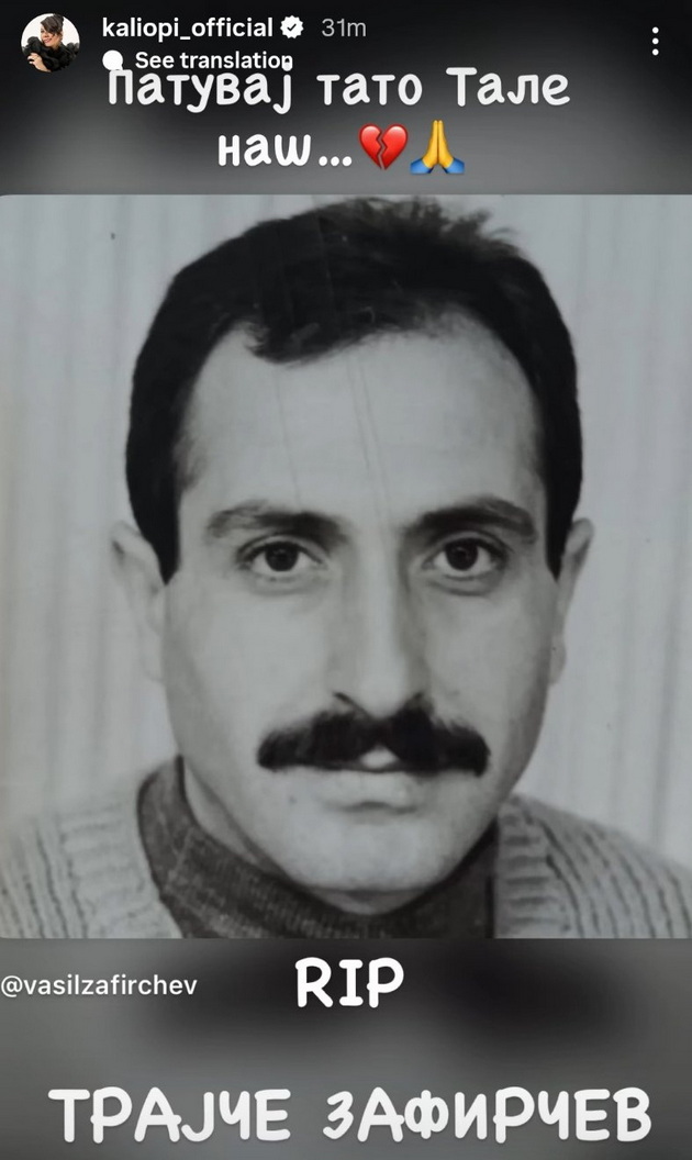 Пејачката објави стори на Инстаграм со негова фотографија и напиша: „Патувај тато Тале наш“.