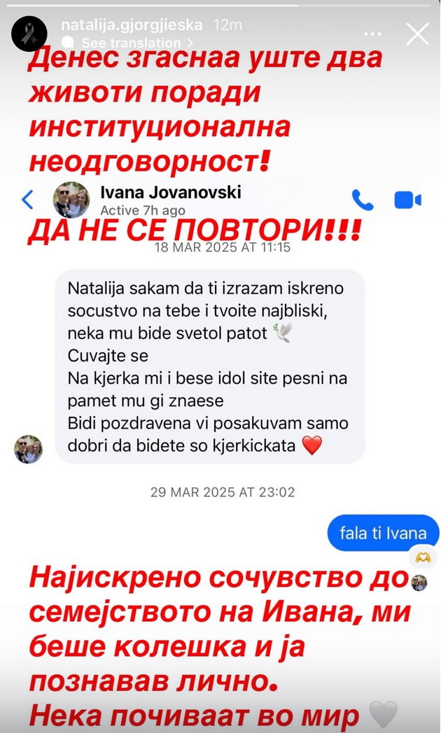 „Денес згаснаа уште два животи поради институционална неодговорност. Да не се повтори! Најискрено сочувство до семејството на Ивана, ми беше колешка и ја познавав лично. Нека почиваат во мир“.