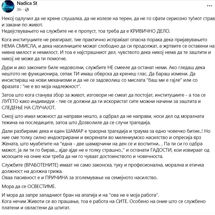 „Крикот и плачот на беспомошните и незаштитените во оваа држава ги слушаме дури откако засекогаш ќе згаснат“...