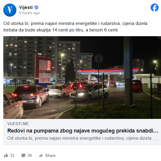 Од друга страна, црногорското Министерство за енергетика и рударство тврди дека нема недостиг од нафтени производи, ниту дека постои ризик од прекини во снабдувањето на пазарот.