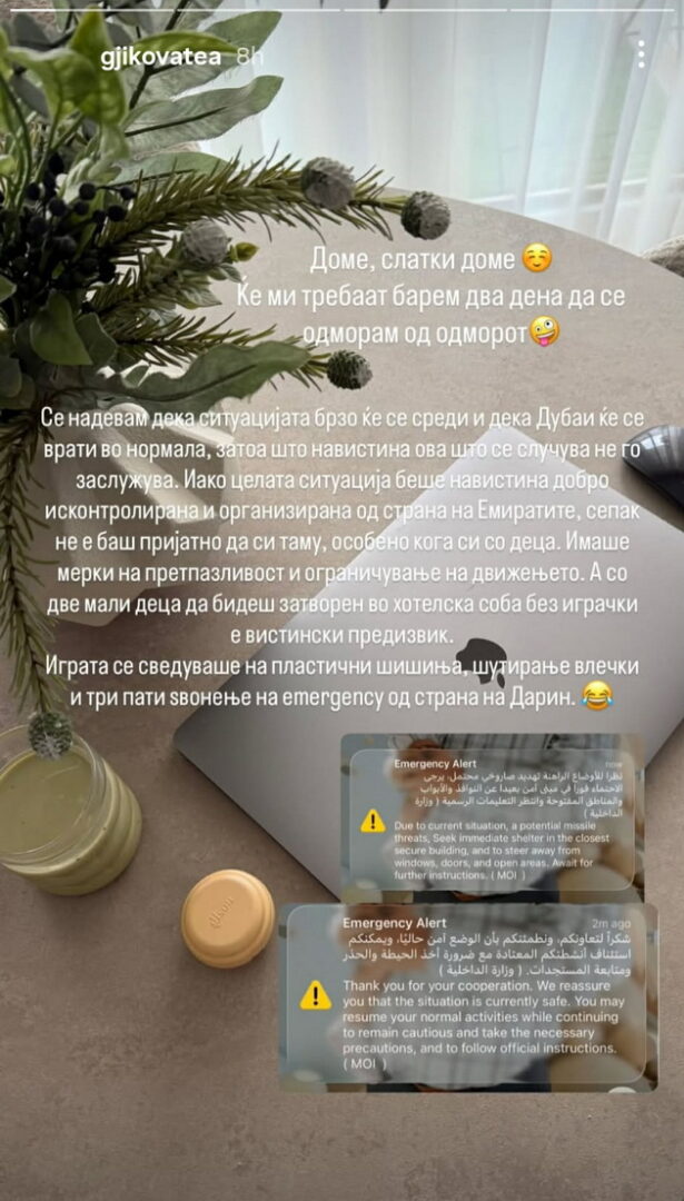 „Се надевам дека ситуацијата брзо ќе се среди и дека Дубаи ќе се врати во нормала затоа што навистина ова што се случува не го заслужува. Иако целата ситуација беше навистина добро исконтролирана и организирана од страна на Емиратите, сепак не е баш пријатно да си таму, особено кога си со деца. Имаше мерки на претпазливост и ограничување на движењето. А, со две мали деца да бидеш затворен во хотелска соба без играчки е вистински предизвик.