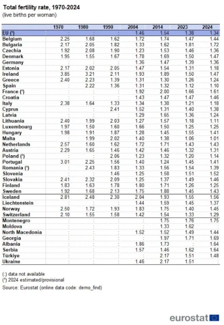 Вкупната стапка на фертилитет во ЕУ изнесува 1,34 живородени деца по жена, што е намалување во однос на 1,38 во 2023 година.
