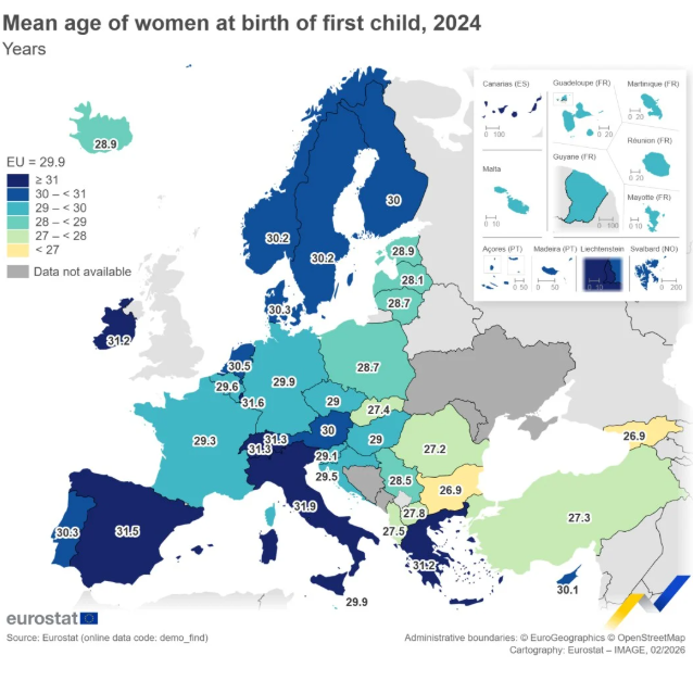 Сличен тренд се бележи и на европско ниво. Во Европската унија во 2024 година се родени 3,55 милиони бебиња, што е 3,3 проценти помалку во споредба со 2023 година.