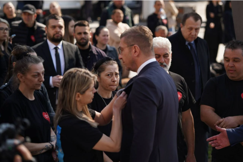 [ФОТО] Емотивен момент во Кочани: Мајка на една од жртвите му стави на Мицкоски беџ со скршено срце и датумот 16.03.2025
