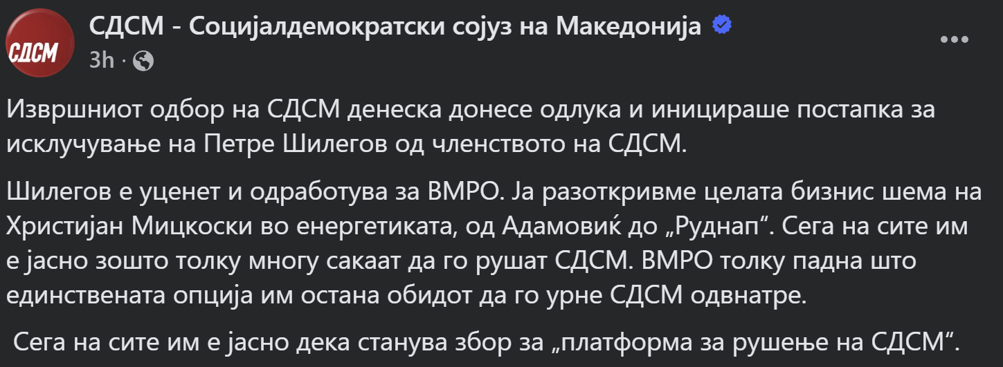 Извршниот одбор на СДСМ донесе одлука да започне постапка за исклучување на поранешниот градоначалник на Скопје, Петре Шилегов, од членството на партијата. Од СДСМ тврдат дека Шилегов е „уценет“ и работи во интерес на ВМРО-ДПМНЕ, додека тој најавува платформа за внатрешни реформи и бара промени во раководството.