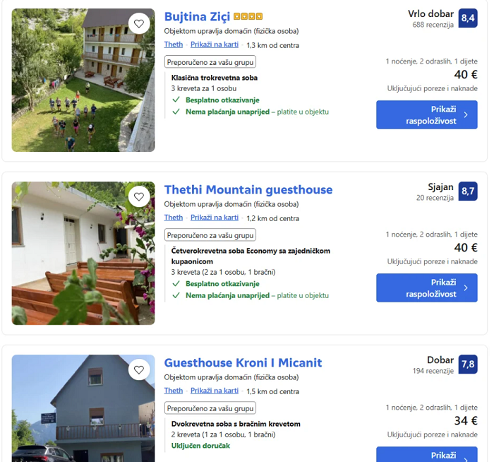 Добрата вест за патниците кои сакаат да го истражат овој спектакуларен планински крај е дека сместувањето во селото Тет сè уште спаѓа меѓу многу пристапните во европски рамки. На популарни платформи како „Booking“, може да се најде ноќевање во семејни guesthouse-ови веќе за околу 40 евра по ноќ, во зависност од термините и типот на собата. Станува збор најчесто за едноставно, но удобно сместување во традиционални куќи опкружени со планини и зеленило, каде што гостите со ноќевањето често добиваат и домашен појадок.