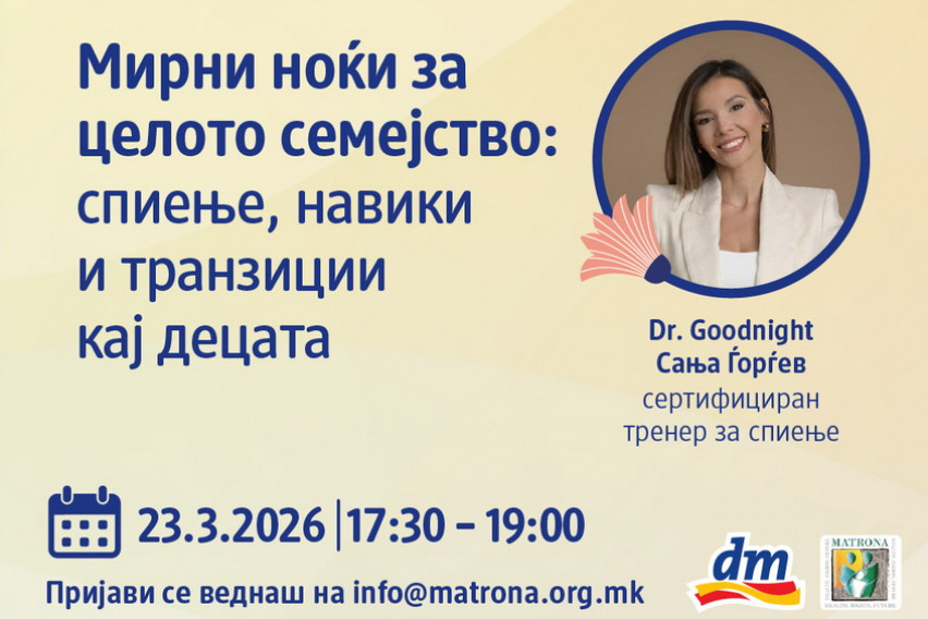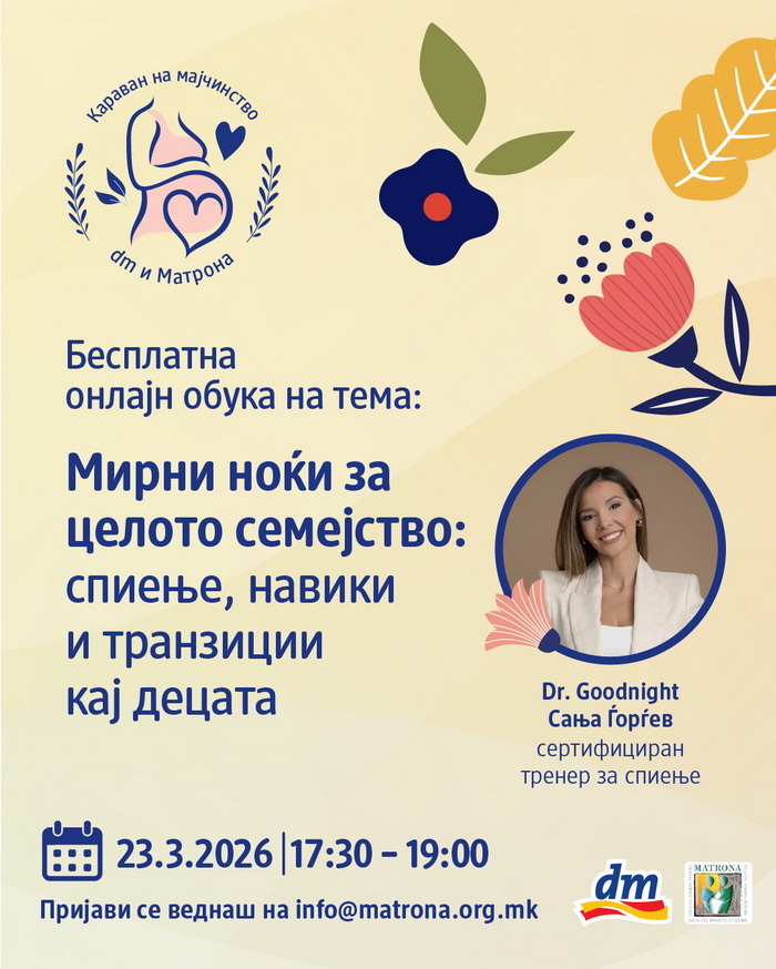 Компанијата dm drogerie markt и Здружение на граѓани за промоција и поддршка на здравјето „Матрона“, ги покануваат мајките, идните родители и сите заинтересирани на бесплатната онлајн обука на тема „Мирни ноќи за целото семејство: спиење, навики и транзиции кај децата“, која ќе се одржи на 23 март, од 17.30 до 19 часот. Сите заинтересирани треба да го потврдат своето присуство на мејл адресата info@matrona.org.mk