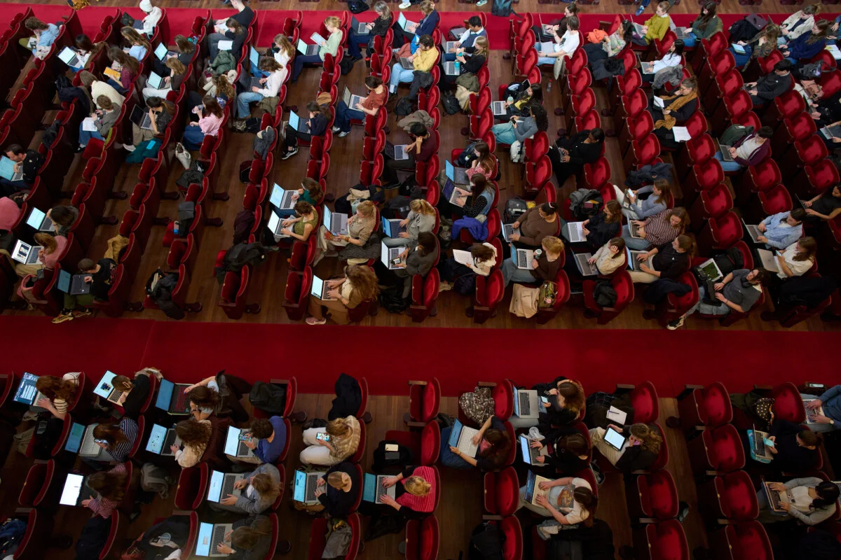 Од сцената на историската концертна сала во Амстердам, виолинистката Хјунџин Чо и виолончелистката Ефстратија Халулаку гледаат кон редовите млади лица осветлени од светлината на екраните на лаптопите.