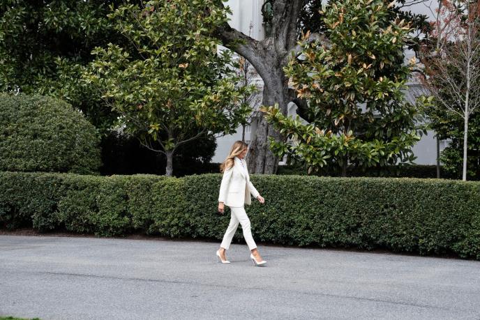 Меланија Трамп влезе на митингот во Белата куќа со хуманоиден робот. Во преден план е самиот самит, но вниманието го привлекува и нејзиниот беспрекорен стил на облекување - волшебно убав и моќен бел костим „Долче и Габана“ и бели потпетици од Кристијан Лубутен со препознатлив црвен ѓон.