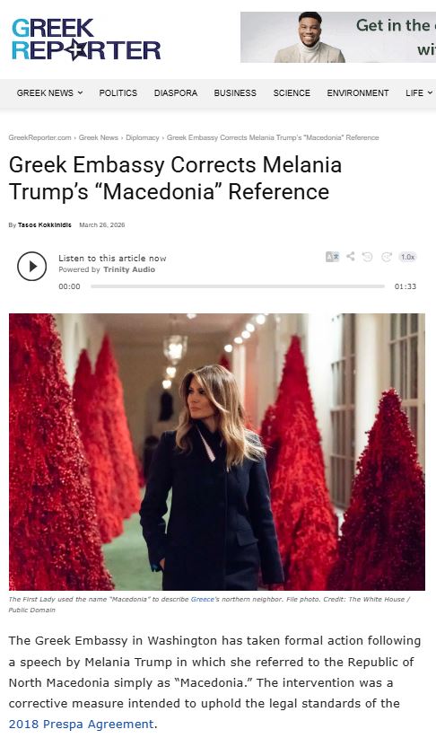 Редоследот на настаните всушност е обратен. Под наслов „Грчката амбасада во Вашингтон го коригираше говорот на Меланија Трамп“, медиумите од соседството објаснуваат дека токму навремената интервенција на грчкиот амбасадор спречила да се случи таква дипломатска грешка, пишува „Дојче веле“.