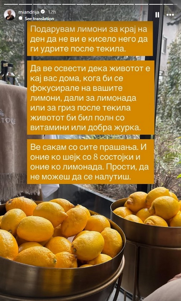 „Подарувам лимони за крај на ден да не ви е кисело - туку да ги удрите после текила.
