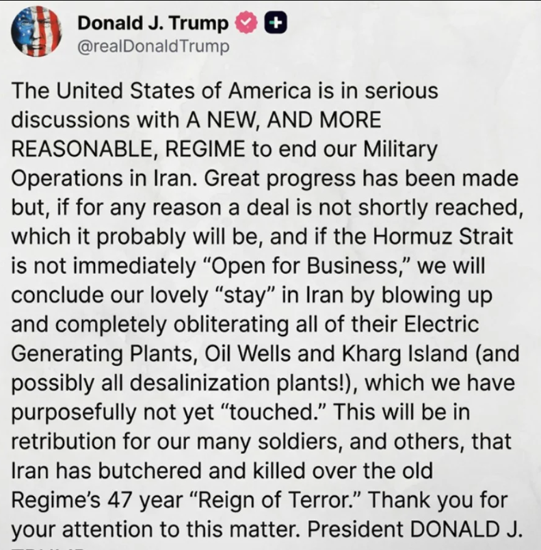„Ако поради која било причина наскоро не се постигне договор, што е веројатно, и ако Ормускиот теснец не биде веднаш ‘отворен за бизнис’, ќе го завршиме нашиот ‘убав’ престој во Иран со дигање во воздух и целосно уништување на сите нивни електрани, нафтени бунари и островот Харг (и можеби сите нивни постројки за десалинизација!), кои намерно не сме ги ‘допреле’“, рече претседателот.
