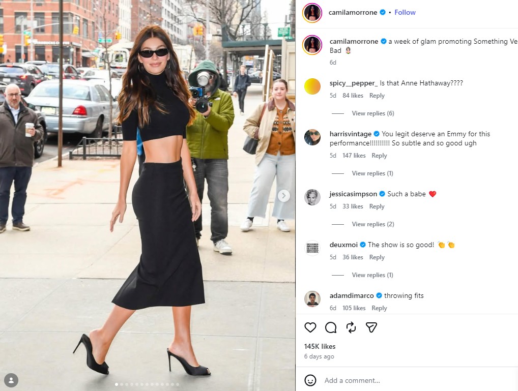 Активна е и на Инстаграм, каде што под профилот „@camilamorrone“ споделува модни кампањи и сцени зад кулисите на своите телевизиски проекти.