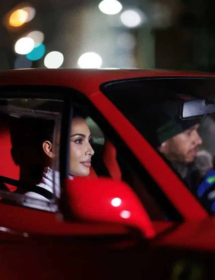 Хамилтон (41) и Кардашијан (45) биле снимени за време на брзото возење на паркингот Даикоко во Токио, а на снимката се гледа Хамилтон како „дрифта“ со своето црвено Ферари Ф40.
