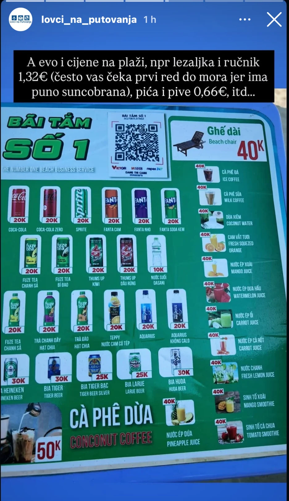 Блогерите за патување од Инстаграм профилот „Lovci na putovanja“ го споделија своето изненадување од цените во Виетнам, каде што цигарите во просек чинат 1 евро, флашираната вода чини помалку од 20 центи, а за лежалка на плажа треба да издвоите помалку од две евра.