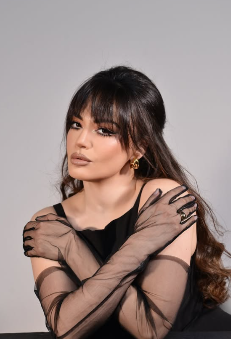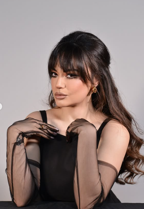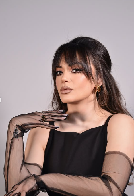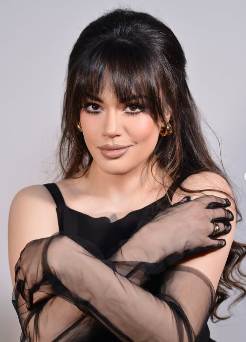 Шминката е во неутрални, природни тонови, со суптилен, но ефектен акцент на очите и усните, што дополнително ја нагласува нејзината природна убавина. Фризурата, пак, со модерни шишки, внесува свежина и мистичност, давајќи му на целиот изглед една суптилна, но моќна димензија.