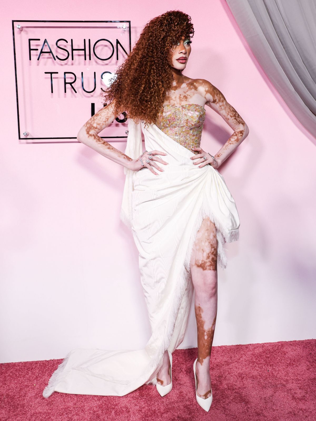 Манекенката Вини Харлоу блесна на доделувањето на американските награди „Fashion Trust“, одржано во Лос Анџелес и покажа неверојатна самодоверба во уште поневеројатна модна креација.