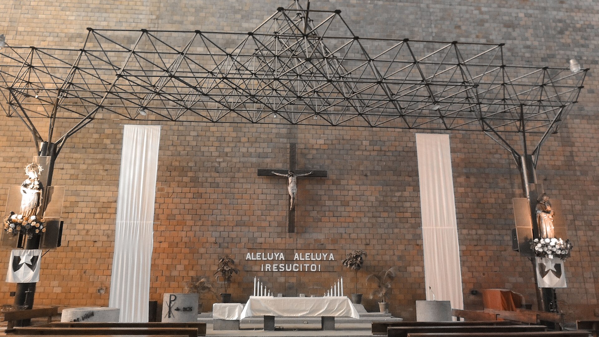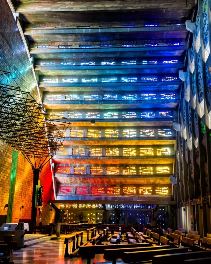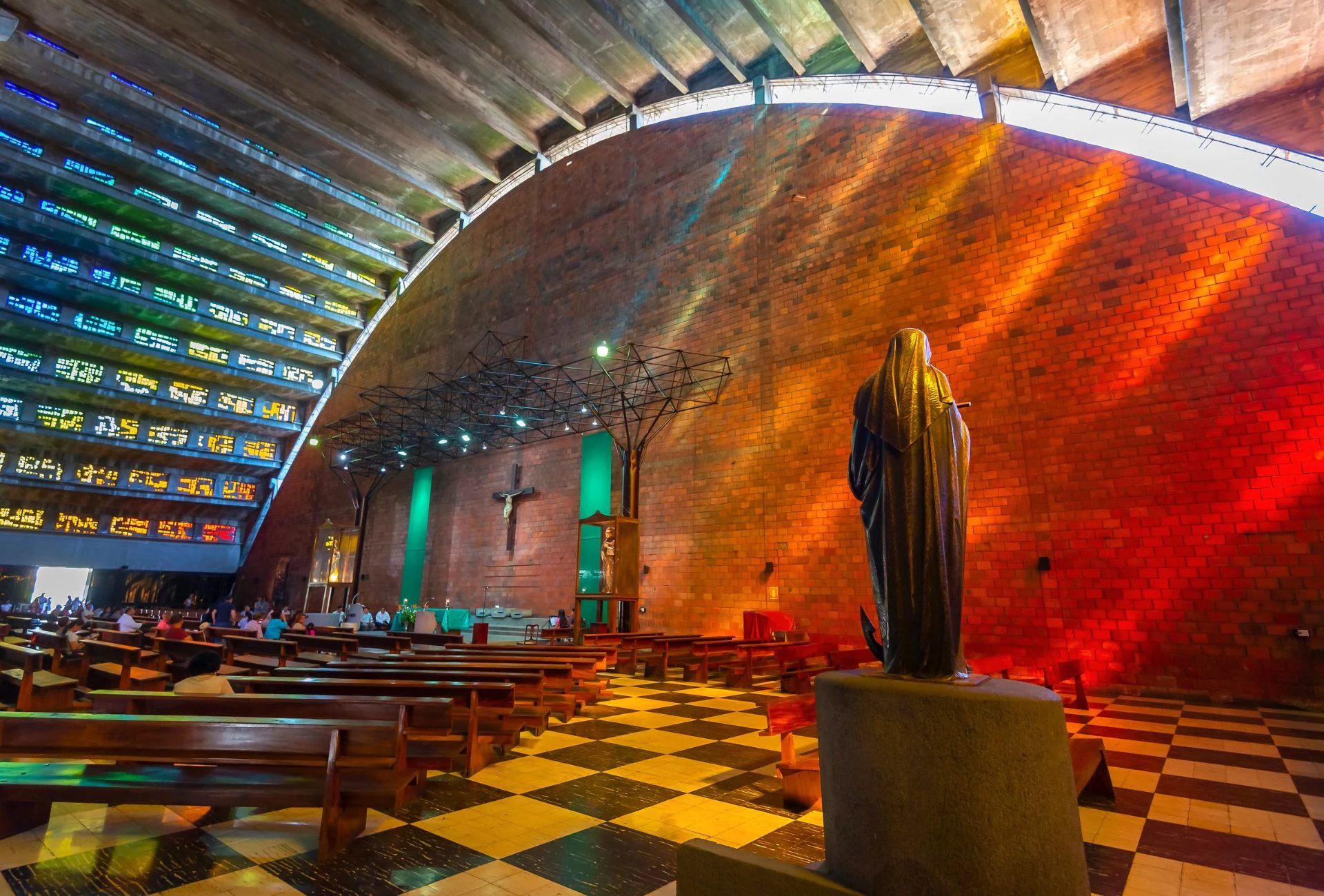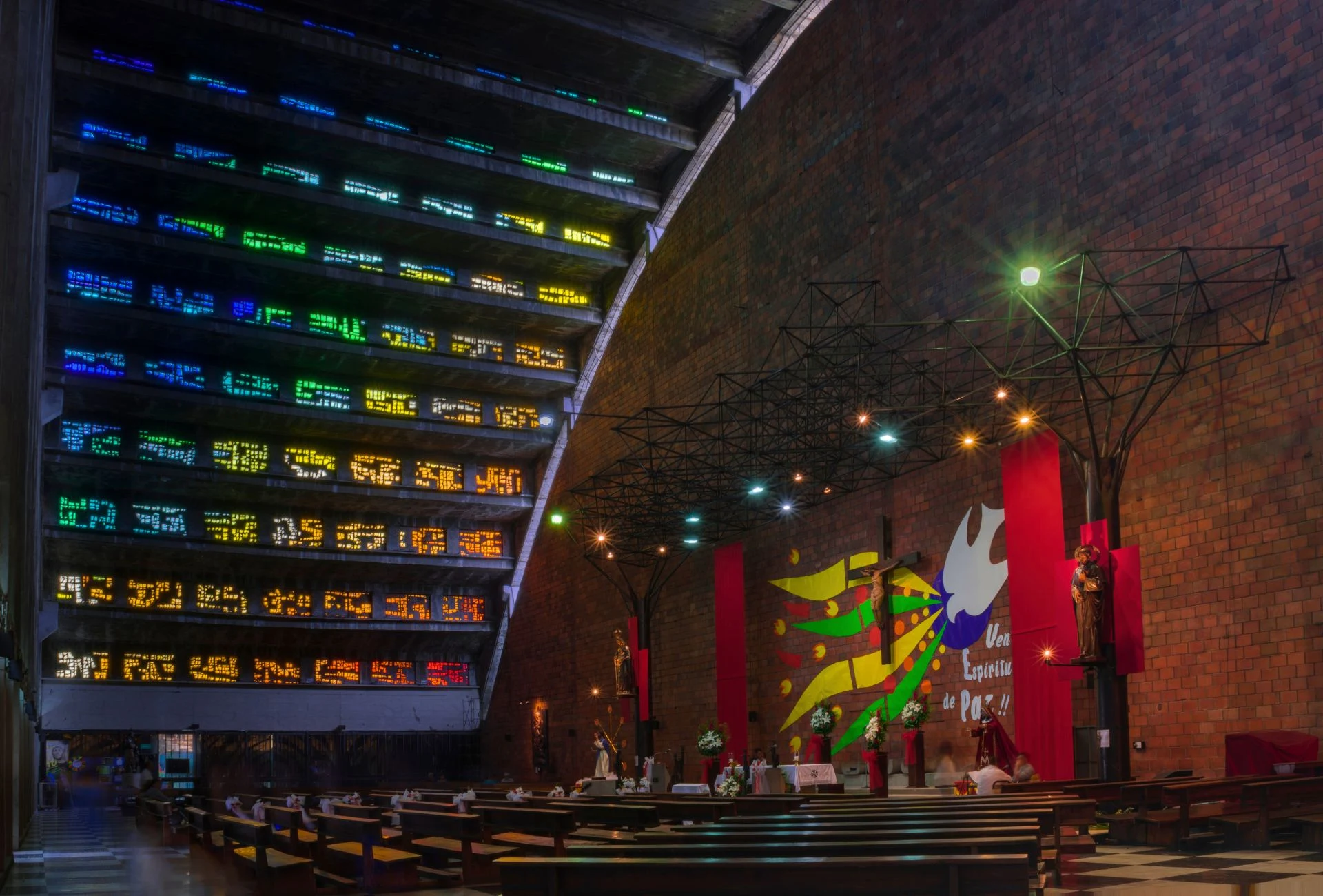 Витражите од повеќебоен кристал, вградени во бетонските ѕидови, создаваат калеидоскопски ефект кој на дневна светлина ја осветлува црквата во нијанси што оставаат без здив. Во јужниот атриум посетителите можат да видат дрвен кип на свети Мартин де Порес, доминикански фратар од Перу кој се грижел за сиромашните, болните и маргинализираните, додека витражите во евхаристиската капела прикажуваат риби што „фаќаат“ светлина.
