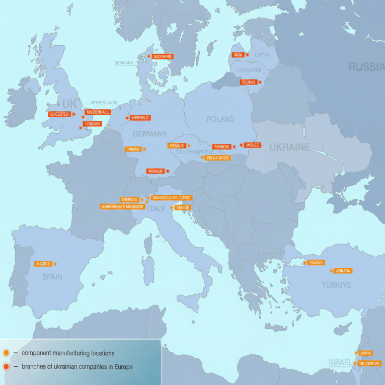 Еден список, под наслов „Подружници на украински компании во Европа“, наведува 11 претпријатија во градови како Лондон, Минхен, Рига, Вилнус и Прага. Другиот, наречен „Странски претпријатија што произведуваат компоненти“, именува 10 компании, од кои некои се сместени во Мадрид, Венеција и Хаифа.