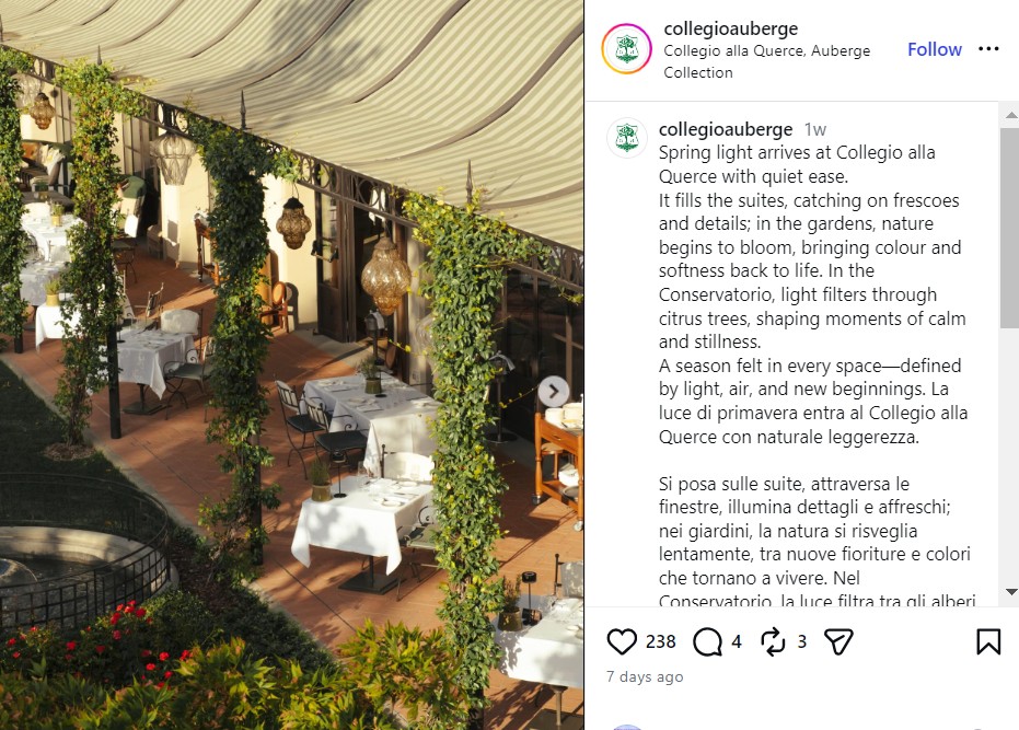 За најдобар нов хотел за 2026 година го прогласиле „Collegio alla Querce“ во Фиренца, кој е сместен на рид и нуди одличен поглед кон градот и воодушевувачки тоскански пејзаж. Хотелот е дел од „Auberge Collection“ и зрачи со историја.