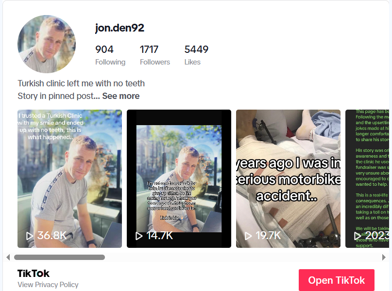 За да го реши проблемот, тој решил да потроши 4.000 евра и да патува во Турција во јануари оваа година за да добие „нова насмевка“. По вградувањето на 14 импланти, тој тврди дека имал „неподносливи болки“ и дека долните заби му „паднале“ по враќањето дома.