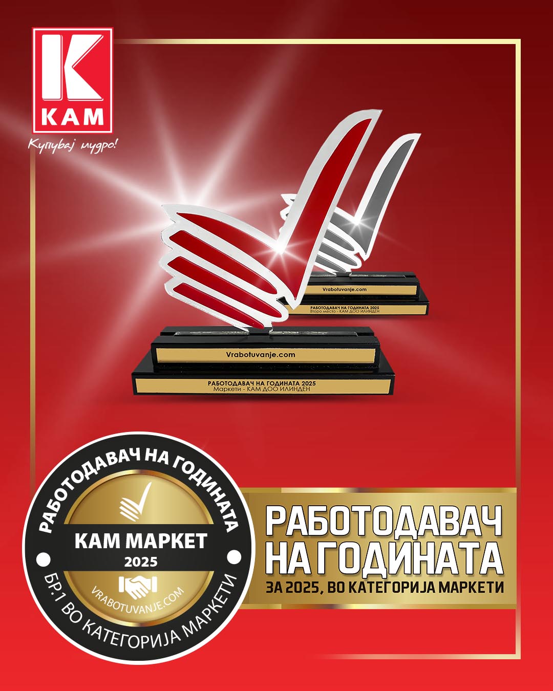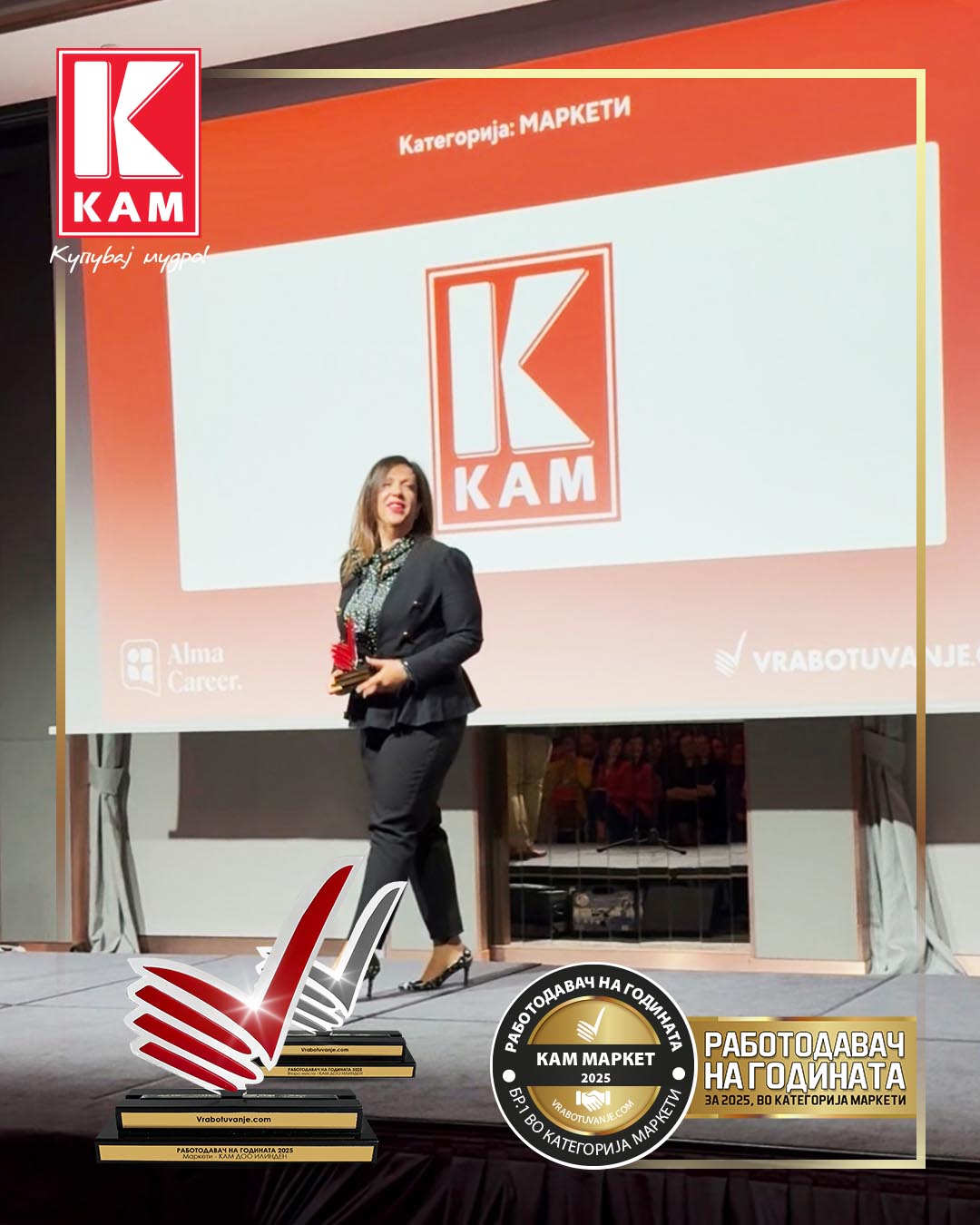 - Особено значајно е признанието „Работодавач на годината“ во категоријата маркети, кое уште еднаш ја потврдува позицијата на КАМ како еден од најпосакуваните работодавачи во малопродажниот сектор. Фактот што оваа награда ја добиваме по трет пат претставува дополнителна потврда за доследноста во градењето организациска култура заснована на доверба, одговорност, развој и грижа за вработените. Второто место во апсолутната категорија помеѓу сите компании во земјата ја позиционира компанијата и пошироко - меѓу најценетите работодавачи во земјава – велат од КАМ.