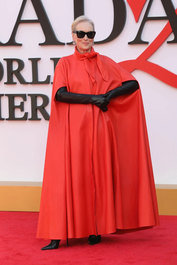 Мерил Стрип (76) секако го украде шоуто, оставајќи ги присутните без здив со драматичната впечатлива црвена наметка-фустан со стилизирана крагна во форма на панделка, која за „Givenchy“ ја дизајнираше креативната директорка Сара Бартон.