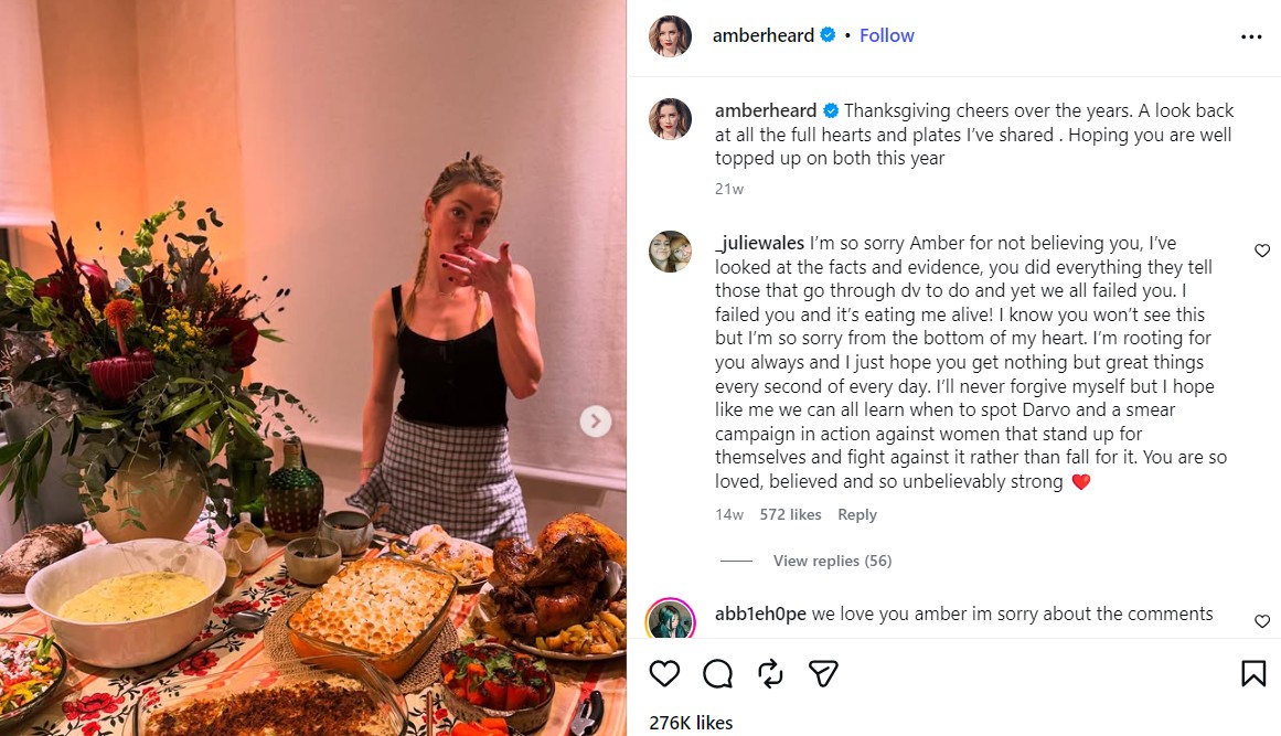„По долго размислување, донесов тешка одлука за спогодба во тужбата за клевета што ја поднесе мојот поранешен сопруг во Вирџинија. Важно е да се каже дека никогаш не го избрав ова. Ја бранев својата вистина и со тоа мојот живот, каков што го познавав, беше уништен. Оцрнувањето со кое се соочив на социјалните мрежи е само засилена верзија на начинот на кој жените повторно се претвораат во жртви кога ќе проговорат. Сега конечно имам можност да се ослободам од нешто што се обидов да го напуштам пред шест години и под услови со кои можам да се согласам“, порачала тогаш.