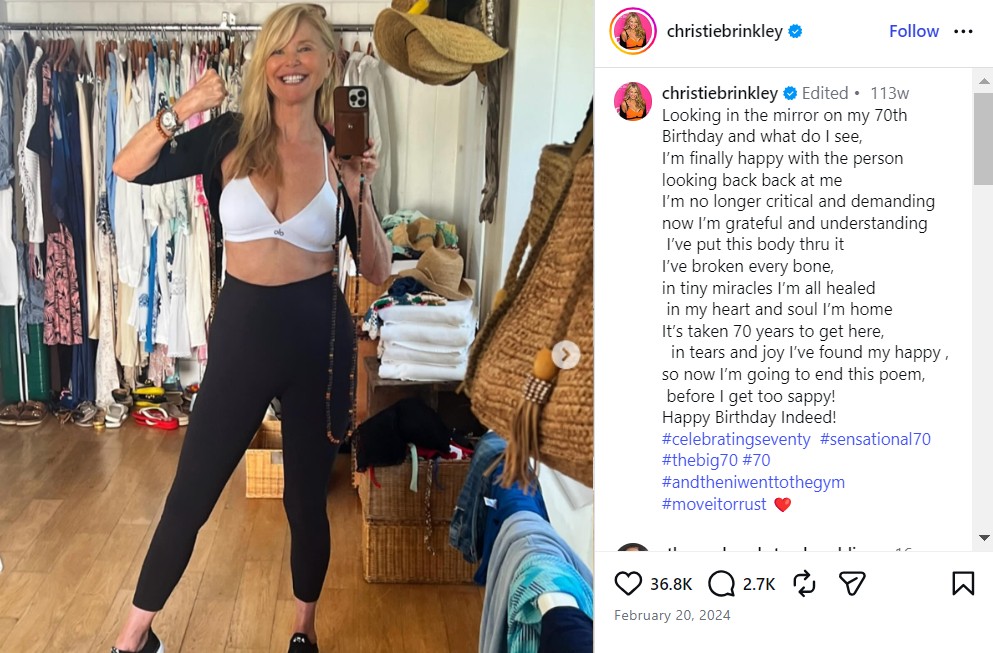 „Ми останаа уште неколку дена од моите секси шеесетти пред на 2 февруари да зачекорам во моите сензационални седумдесетти. Веќе знам дека ова ќе биде спектакуларна година! Го знам тоа затоа што тоа е мојот план, а доволно сум возрасна за да знам дека од мене зависи тоа и да го остварам. Секогаш им велев на своите деца да си го разубават денот, а сега тоа си го велам и себеси — ќе си ја направам оваа година сјајна“, напишала поранешната сопруга на пејачот Били Џоел.