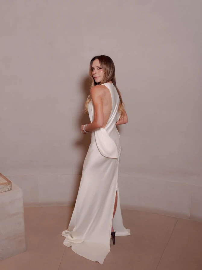 Креаторката, која ја доби наградата „Time100“ како една од највлијателните личности во 2026 година, се појави во прекрасен свилен бел фустан со сирена-крој од најновата колекција на својот бренд, додека нејзиниот сопруг се одлучи за класичен смокинг со лептир-машна.