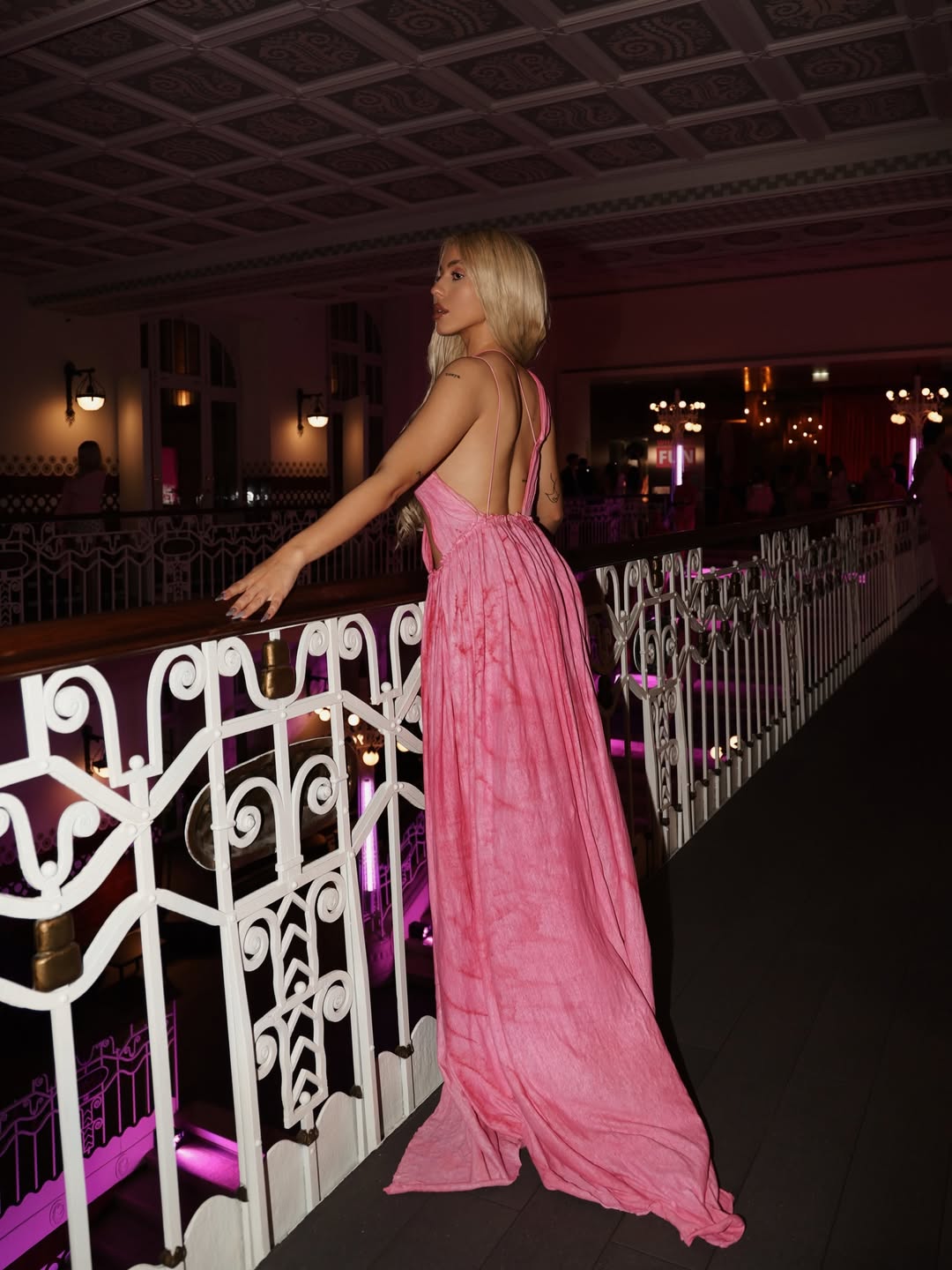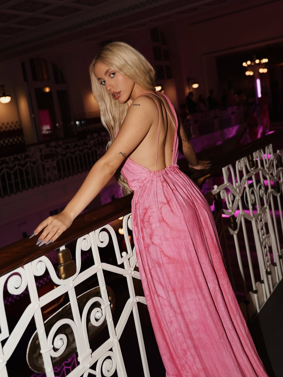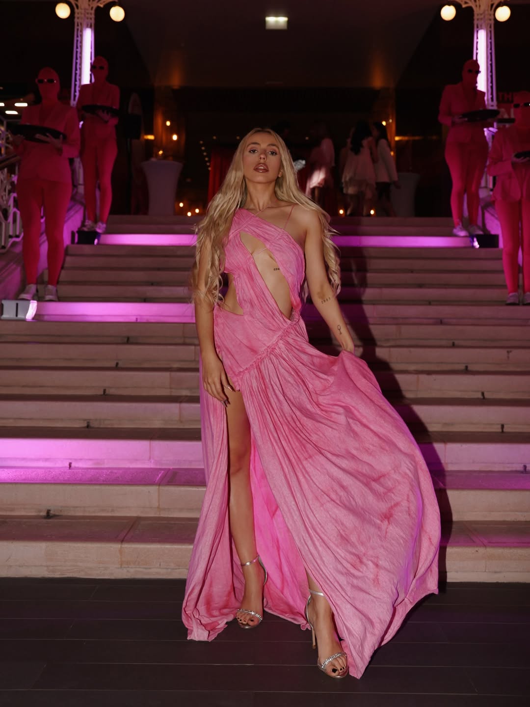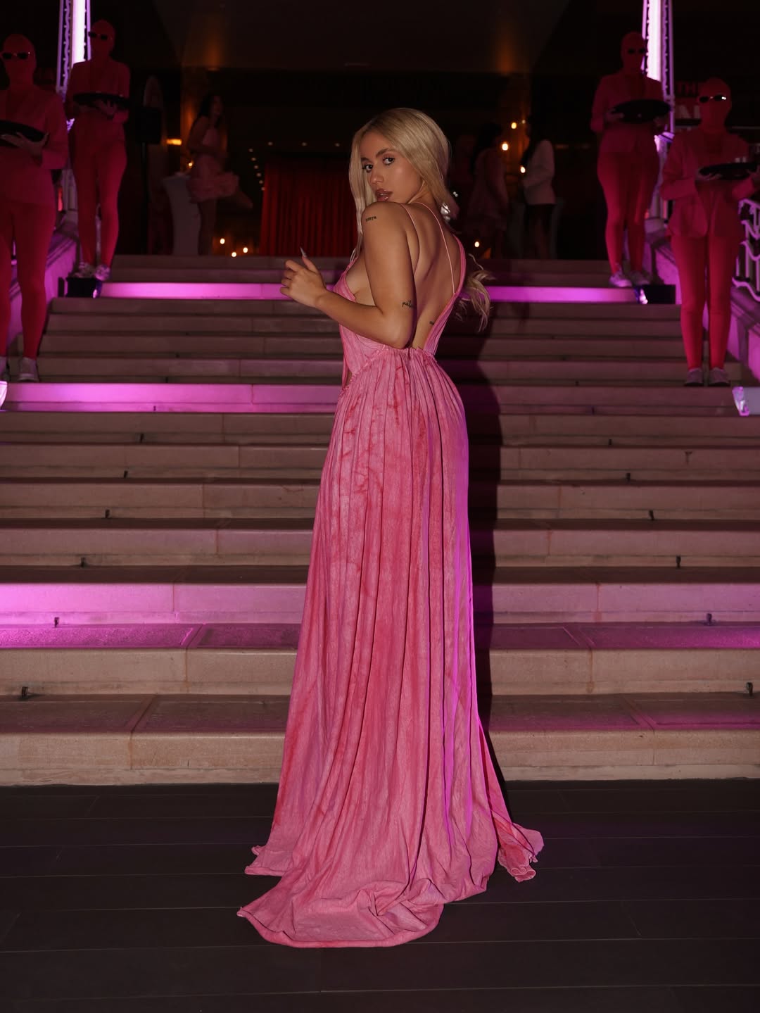 Во розова боја, која доживеа своевидна модна ренесанса по премиерата на филмот „Barbie“, фустанот кој го носеше Антониа смело ги нагласува женските облини.