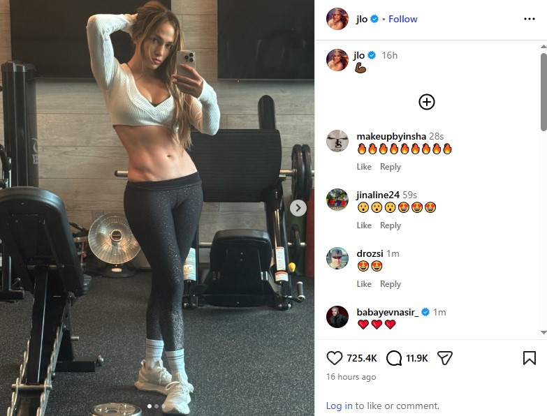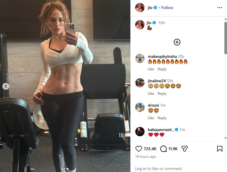 Фотографијата што ја објави од теретана успеа да ги „сруши“ социјалните мрежи и да воодушеви милиони нејзини следбеници за многу кратко време. На објавената фотографија, Џеј Ло позирала во малку спуштени хеланки откривајќи ги прекрасните стомачни мускули.