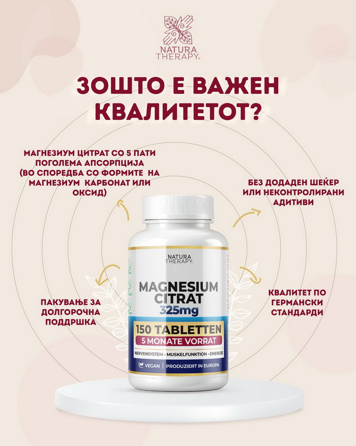 Затоа кога бирате како магнезиум да купите, гледајте тоа да биде магнезиум цитрат, што е квалитетна органска форма, а која телото одлично го апсорбира, брзо делува и дава реална поддршка на телото. Македонската компанија Натура Терапи нуди на пазарот ваков квалитетен производ Магнезиум цитрат, произведен по германски стандарди.
