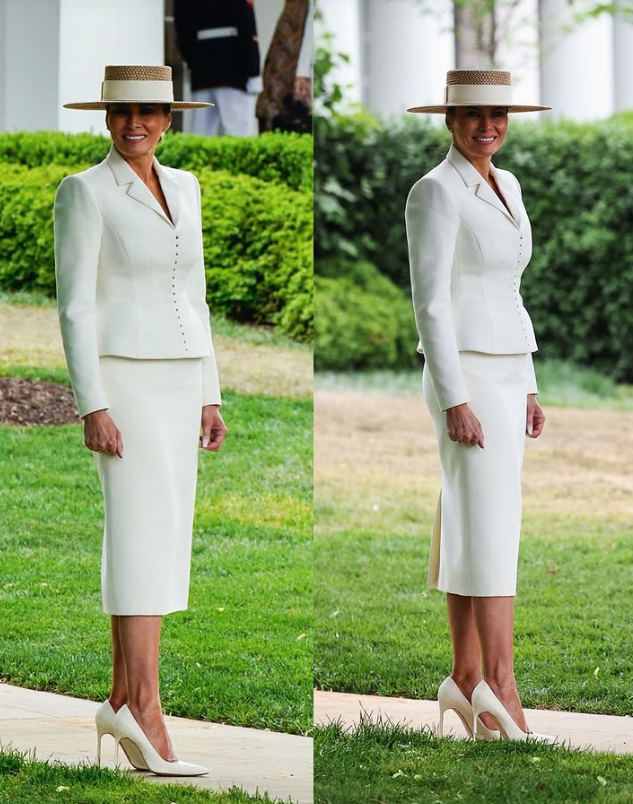 Да ве потсетиме дека за време на целата посета на Чарлс и Камила, Меланија блеска во своите комбинации. Претходно во текот на денот, првата дама на Америка носела шик бел ансамбл од Ралф Лорен, кој се состоел од струкирано сако и тесно миди здолниште, во комбинација со широка шапка од Ерик Џавитс и мокасини од Маноло Бланик.