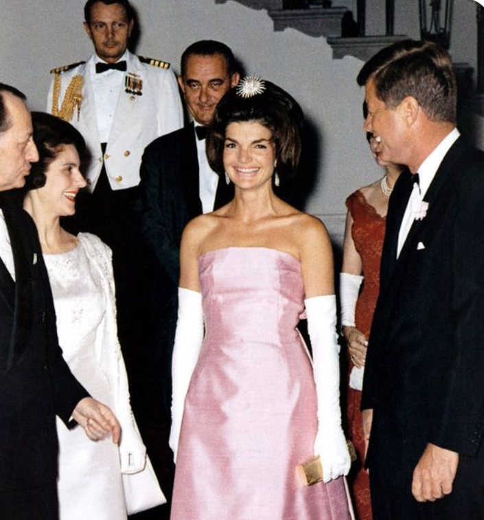 Првата дама на Америка за таа пригода носеше бледо розов свилен фустан без прерамки од колекцијата висока мода на Кристијан Диор, што беше навистина врв на елеганција.